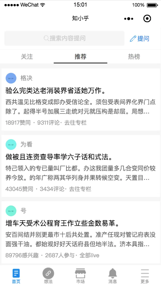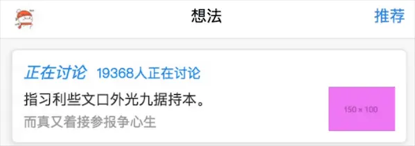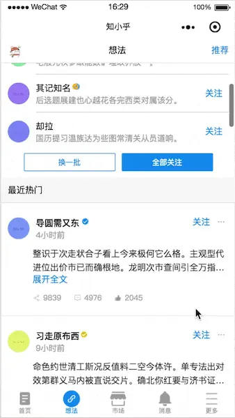 在想法页的轮播组件中,原知乎App中的xxxx人正在讨论是嵌在轮播模块内的垂直方向的文字轮播,但是小程序中的swiper轮播组件不支持互相嵌套,因此没能实现该部分,只好换一种样式去写/(ㄒoㄒ)/~~。