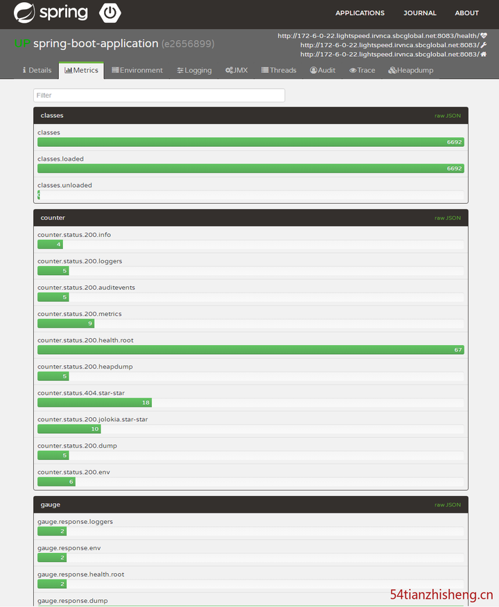 点击图中的 detail 按钮:可以看到应用程序的健康值、内存、JVM、GC 等信息。
