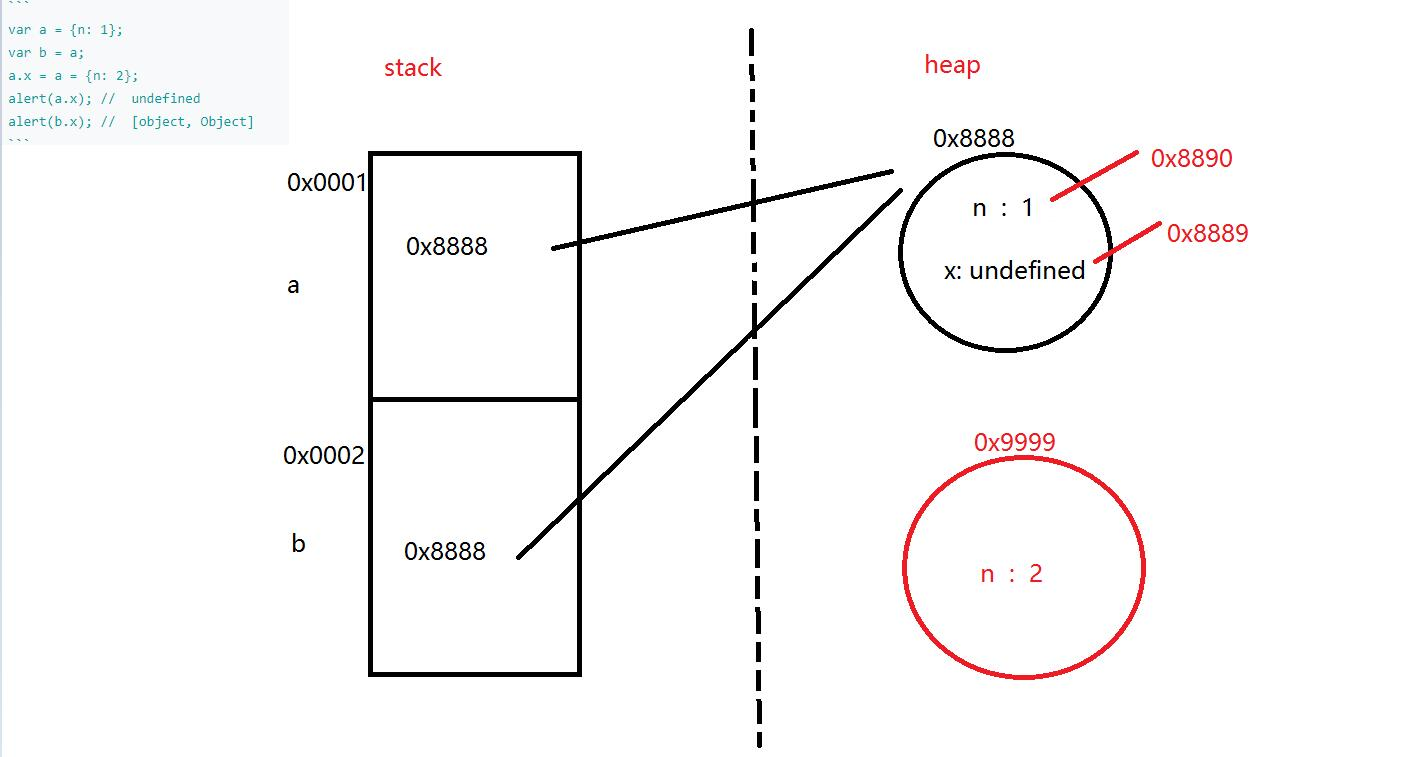 最后因为a的地址是指向0x9999的,且其不存x这个属性,故返回undefined。而b的地址指向里面存在一个保存{n:2}的地址的x属性,故返回的是对象。