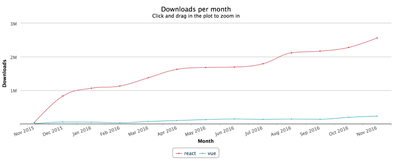 毫无疑问,React目前比Vue要受欢迎许多——它在NPM上每个月的下载量约为250万次,而Vue只有22.5万次。