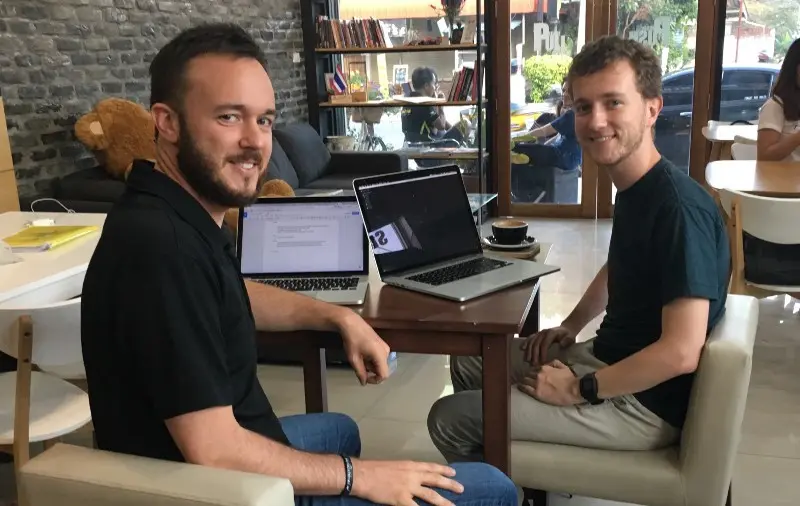 Anthony(左)和 Alexis(右)在泰国清迈的Bull and Bear咖啡馆里比较React和Vue