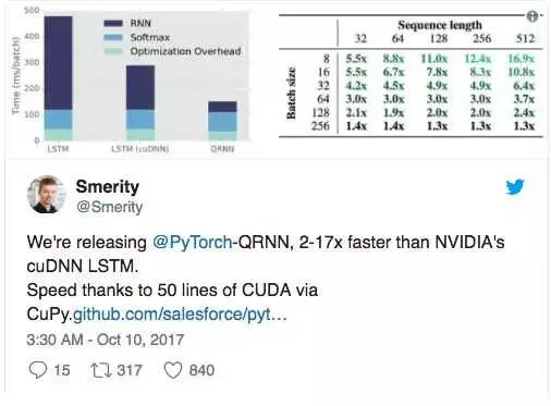 “我们发布的 @PyTorch-QRNN,拥有 2 倍到 17 倍于英伟达 cuDNN LSTM 的速度表现。这样的速度水平要归功于通过 CuPy 实现的 50 行代码。”