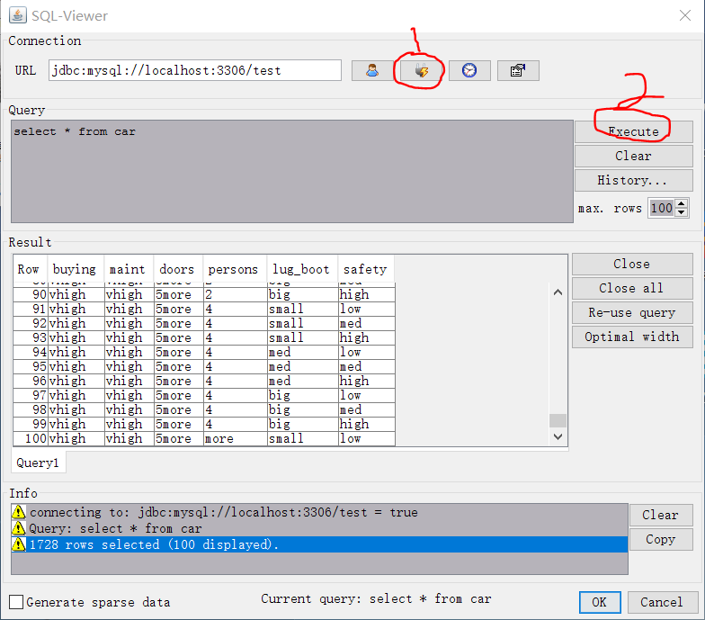 最后要想用weka打开数据库中的数据还需要在中间的query中写SQL语句点击查询(2处)查询出结果