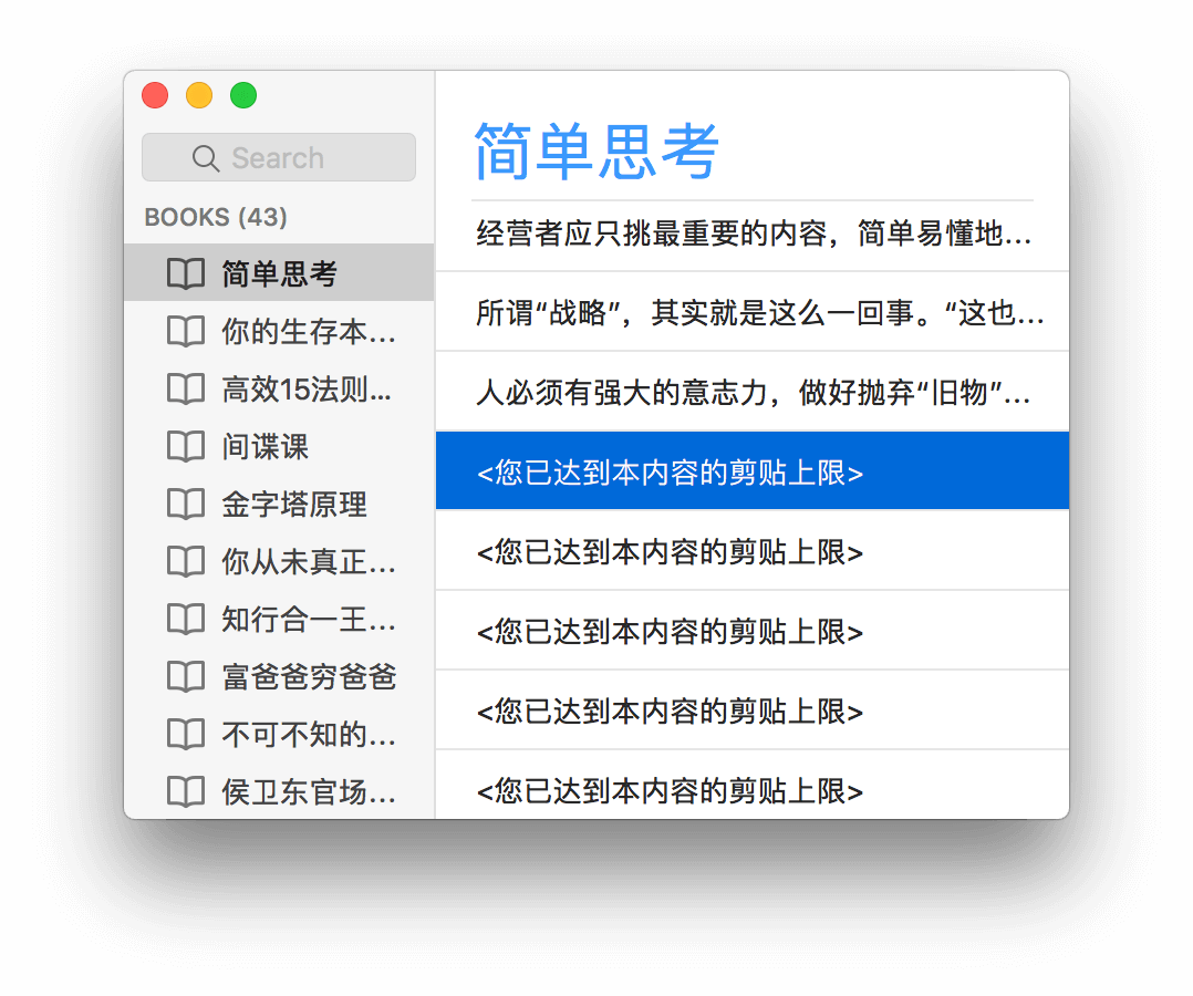 使用 Kindle 的重度用户会知道,在 Kindle 上读书时可以任性标注,但在导出标注时则有限制:Kindle 限制能导出的标注的文字总数。这个比例没有明文规定,各本书也有不同,通常理解是一本书所有内容的 10%;一旦超出这一限制,导出时则会看到恼人的 <您已达到本内容的剪贴上限>。