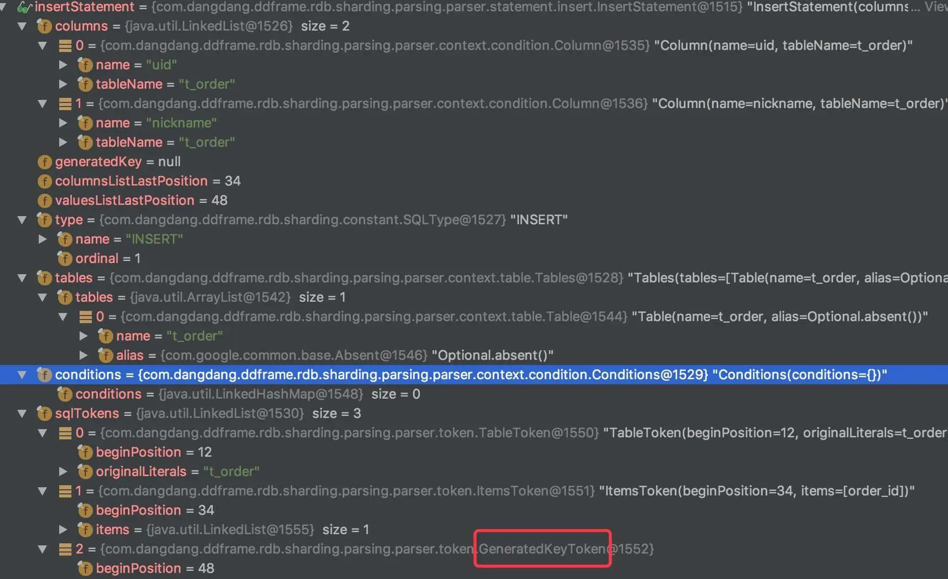 我们来看下 INSERT INTO t_order (uid, nickname) VALUES (?, ?) 的解析结果: