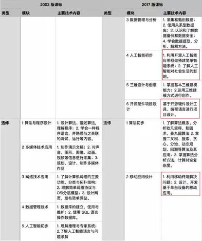 相比于 2003 版课标,此次公布的“新课标”中,在技术(信息技术和通用技术)上给予了学生更大的发展选择空间。可以看出,“新课标”大幅度减少了对于基本软件使用的要求,而大幅度提升了在编程、计算思维、算法方面的思维要求,以及人工智能、开源硬件、网络空间安全等知识面要求。