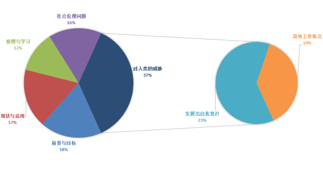 在所有跟人工智能相关的问题中,提到最多的是人工智能发展对人类的威胁,占37%:其中23%的同学担忧人工智能会拥有自己的思维和意识,从而使得人类失去对其的控制,另外14%担忧人工智能将在各行各业与人类竞争工作机会,并最终取代人类。