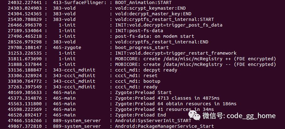 比如 ccci_md3 vold ,这里也会将每个进程的创建开始和结束打印出来。然后我们进入zygote进程的创建,看到加载预处理的jar so,可以看到这些耗时。