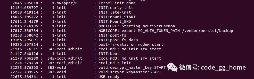 看下这个总时间是否超长,然后去细化看下哪些驱动加载耗时,将一些无用的驱动加载可以移除掉,加快开机时间。kernel启动结束的时间(这个关键字确定Kernel_init_done)