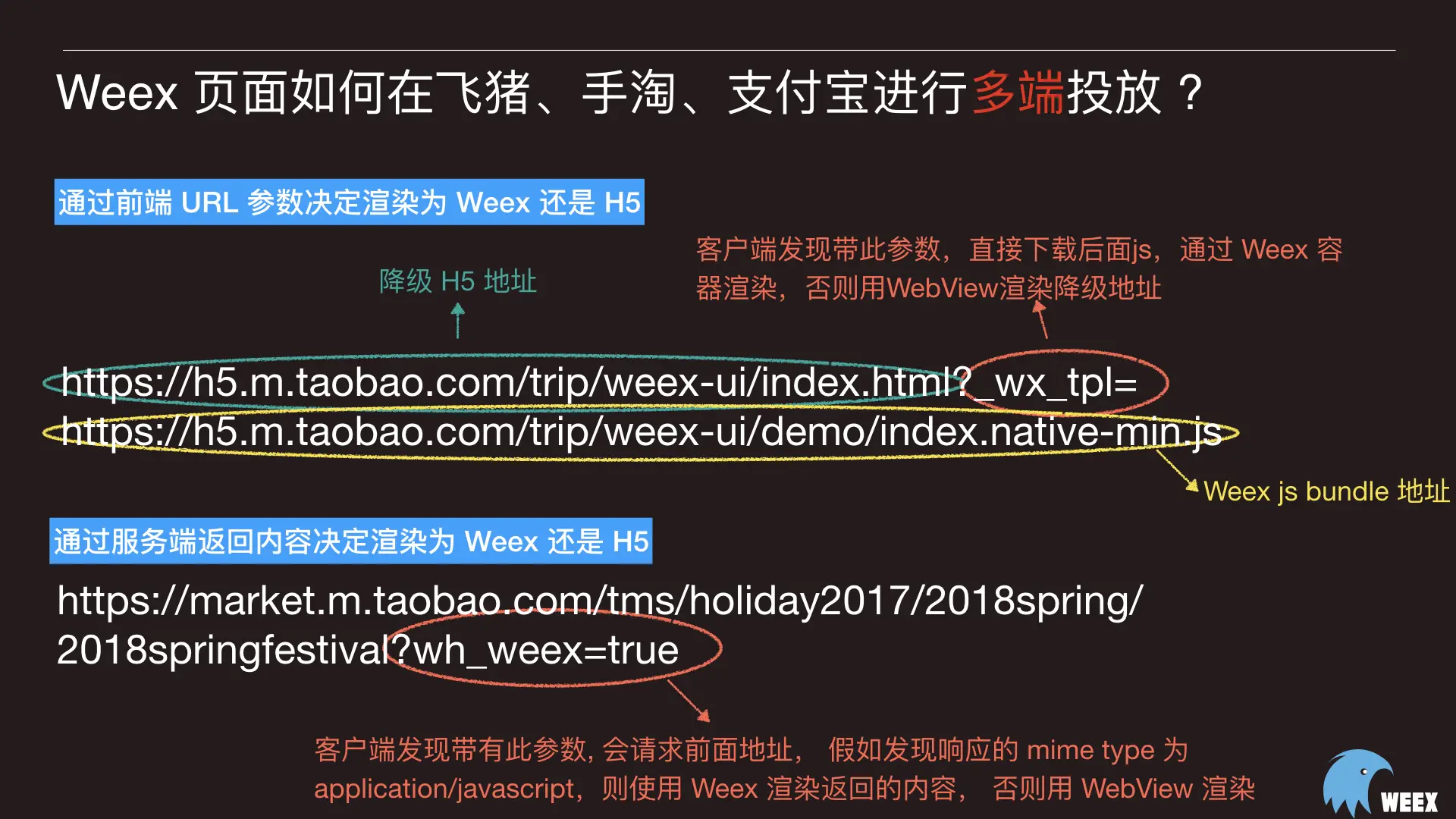 那你可能会问 Weex 页面如何在飞猪、手淘、支付宝进行多端投放呢 ? 这里有两种方式,第一种为通过前端 URL 参数决定渲染为 Weex 还是 H5