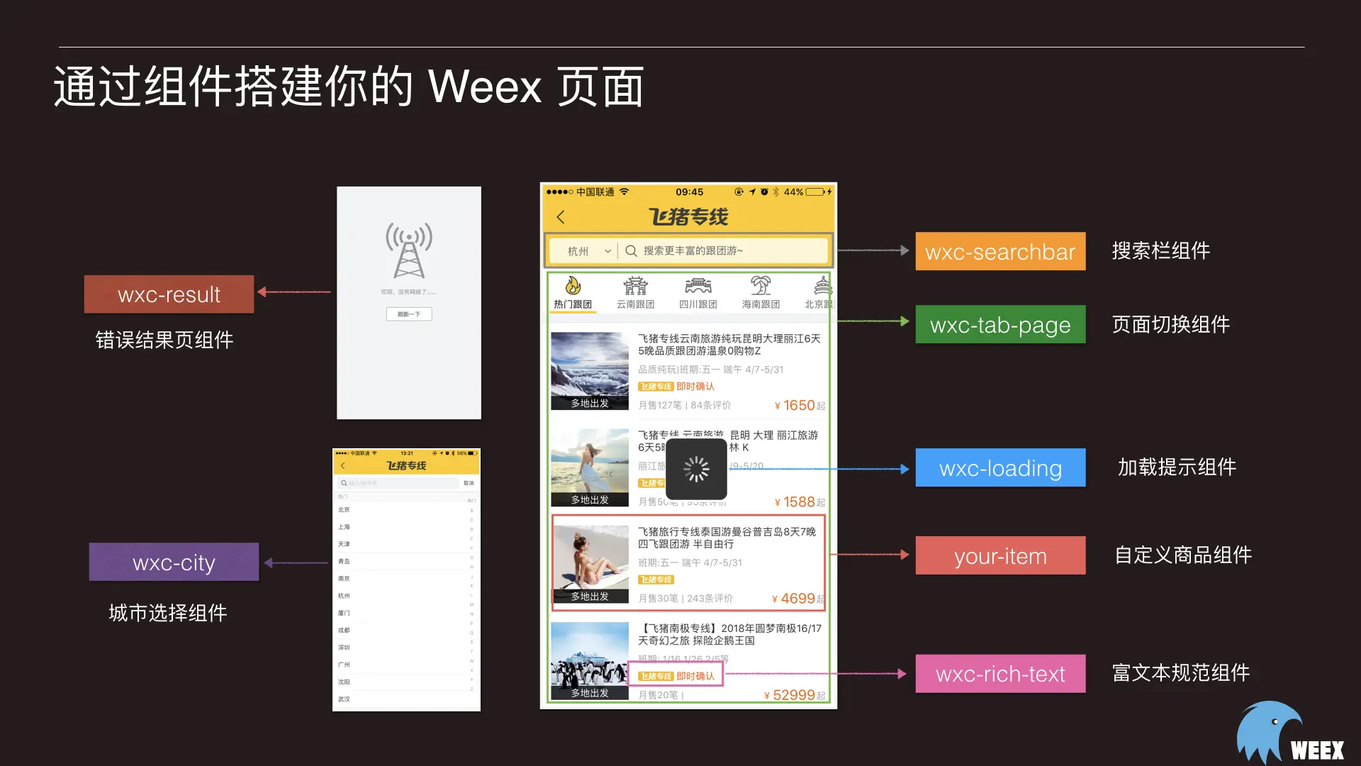 很多时候基础建设,其实为了给业务开发来加速,譬如接下来这个飞猪专线的页面就是通过我们的Weex Ui组件库来搭建起来的
