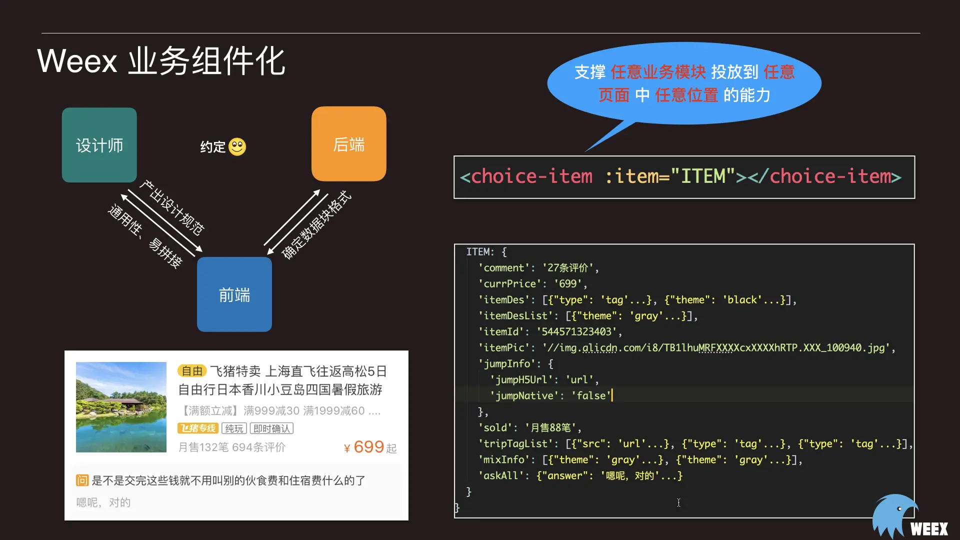 业务组件库更多是前端、后端、设计师之间的一个“约定”,通过一定规范共同让业务组件变得可复用。也即Weex代码中直接引入此组件,直接插入后端返回的原始数据,就可以生成设计师所设计出的商品卡片,最终可以做到支撑任意 Weex 业务模块 投放到 任意 Weex 页面 中 任意位置 的能力。