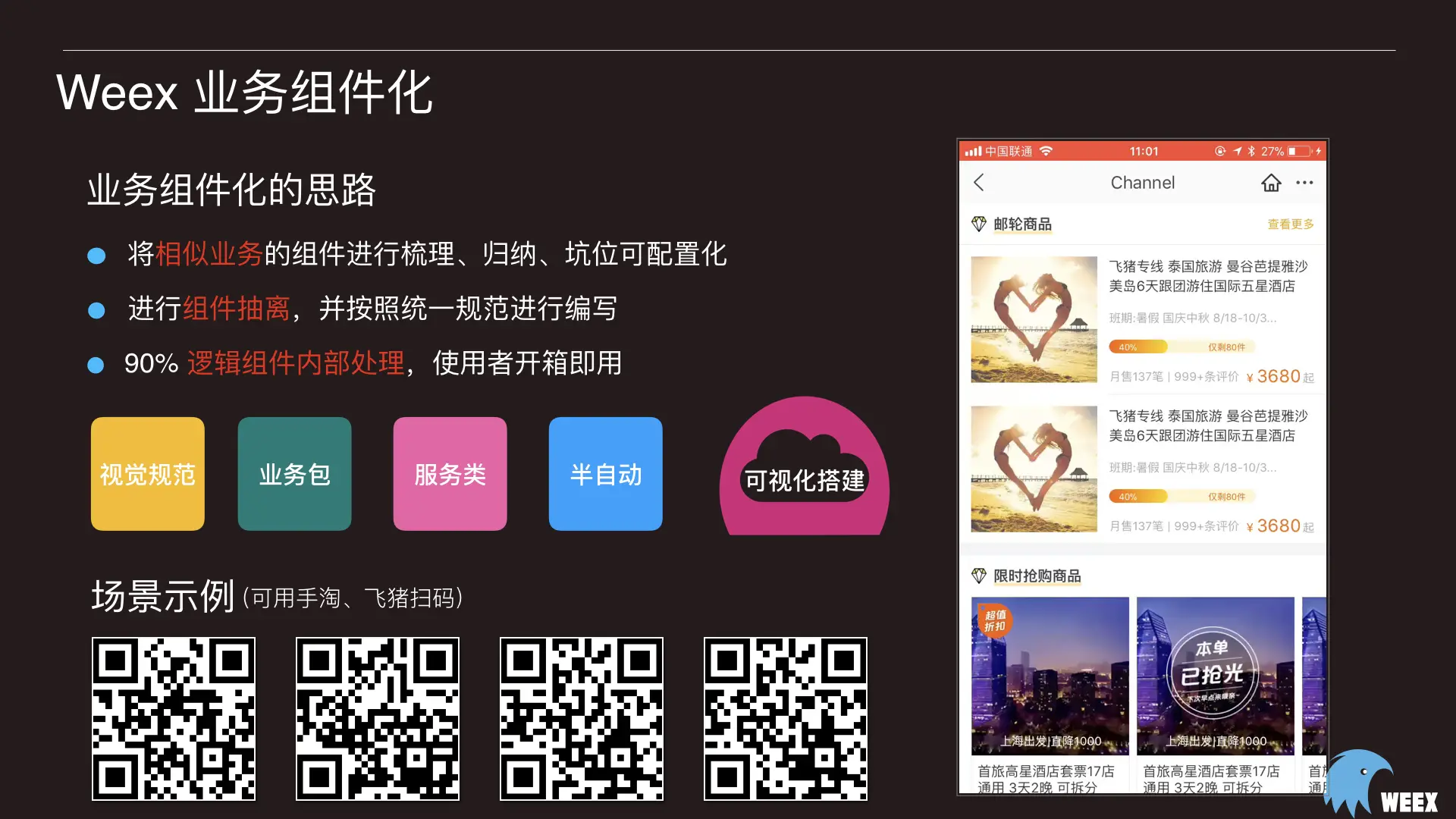 目前 Weex Ui 组件库包括7大类31个成熟的组件,同时并不是直接开源给大家使用,而是在内部已经使用了1年多后稳定后开源给大家使用,大家可以通过手淘、飞猪、任何浏览器扫码进行预览