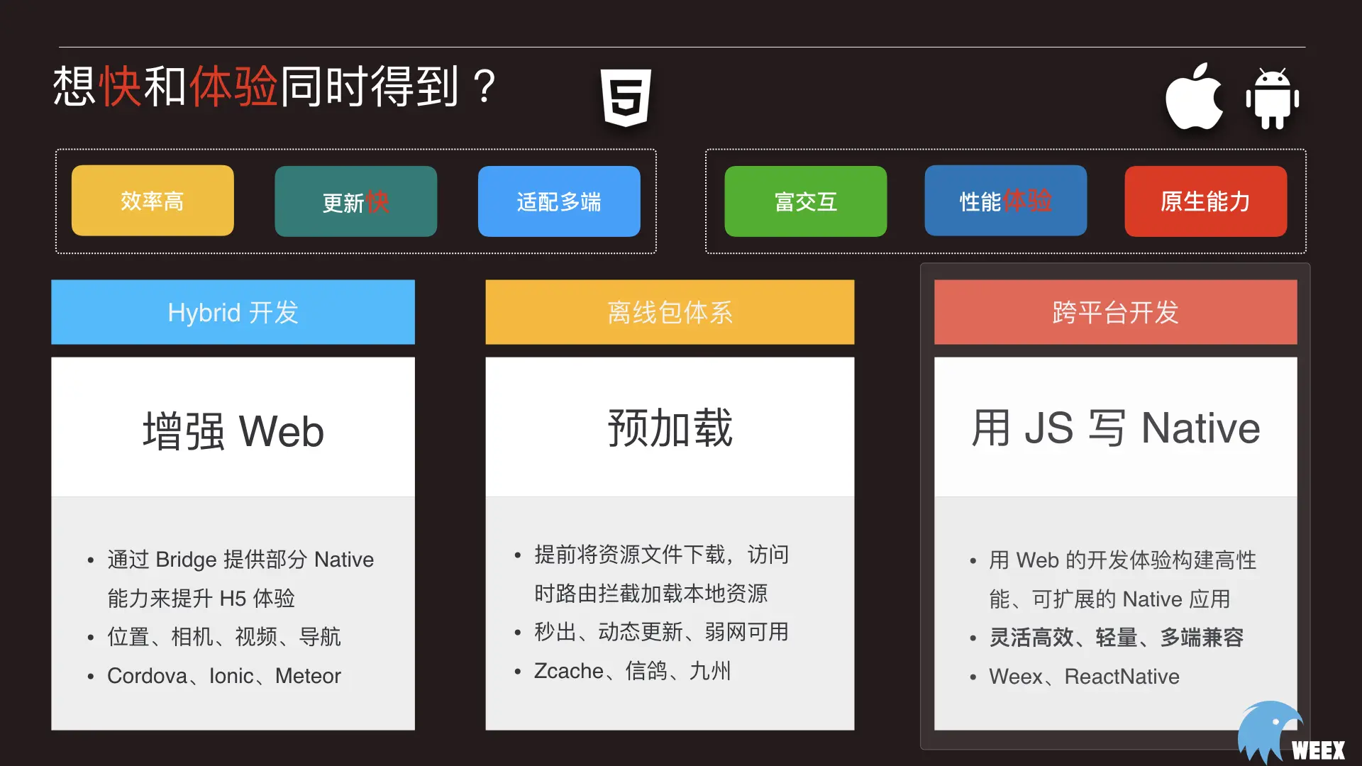我们为什么选择Weex作为我们首要的跨端开发技术呢?写过H5的同学肯定会被它的简单高效、发布即更新、一条URL可适配多端等这些快所吸引,但写过 Native 的同学肯定也会被 Native 的富交互、性能体验、可调用原生能力、可管理内存等特性给我们的业务带来更好的体验。