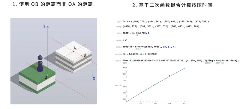 还有一点值得一提,按压时间这部分还是有优化的空间,前面提到了跳跃距离和按压时间基本是线性关系,但越到后面可以越发现,距离并非和按压时间绝对成线性比例,因为游戏本身不是一个纯 2D 的平面场景(2.5D),所以我们测量到的直线距离在 2.5D 场景中是有变化的,虽然影响不大,但在游戏后期棋盘越来越小,距离越来越大时,容易凸现出问题来,所以关于距离的计算有几种不同的解决: