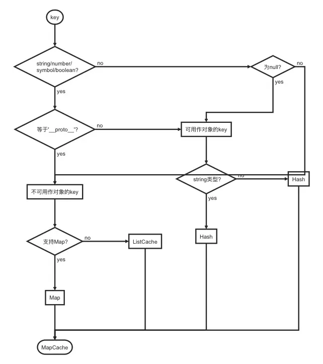 首先,判断 key 的类型,以是否为 string/number/symbol/boolean 类型为成两拨,如果是以上的类型,再判断 key 是否等于 __proto__ ,如果不是 __proto__ ,则使用 Hash 缓存。不能为 __proto__ 的原因是,大部分 JS 引擎都以这个属性来保存对象的原型。