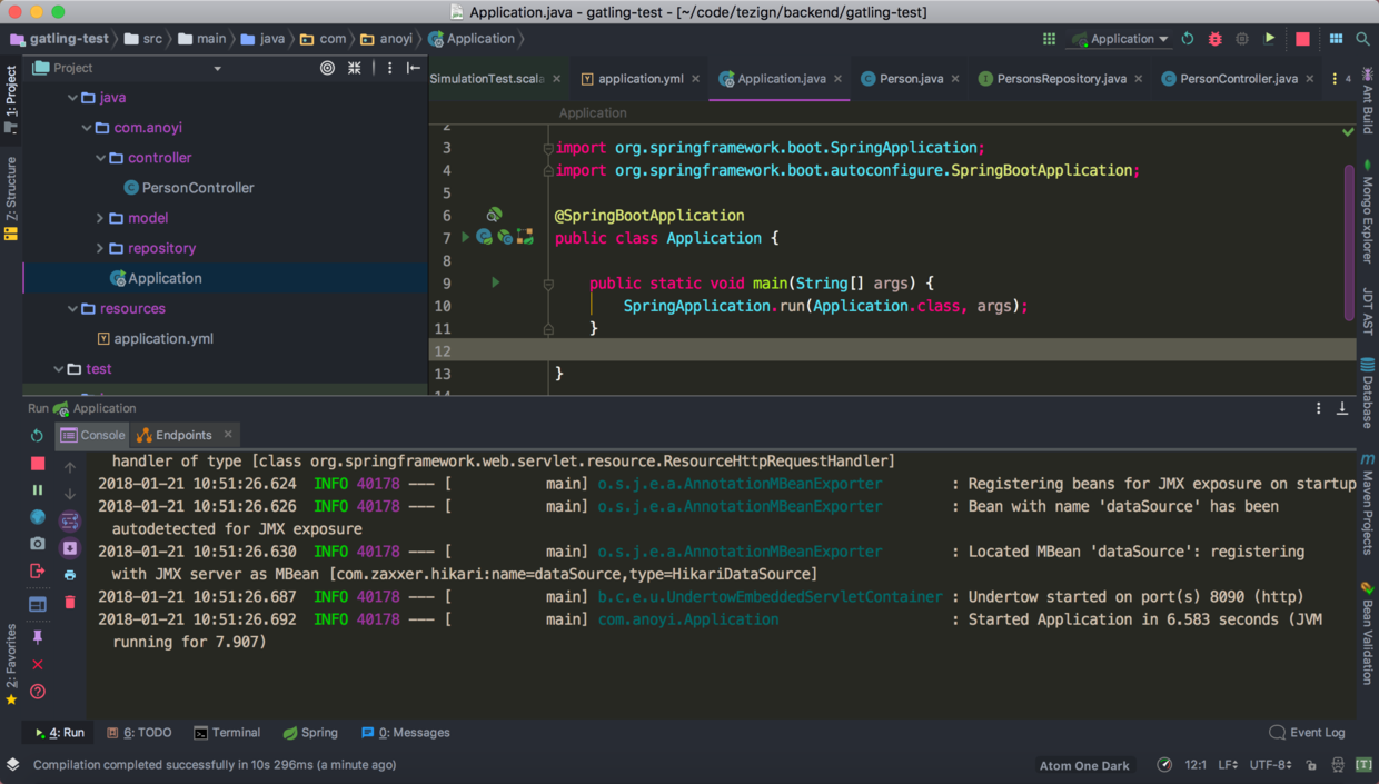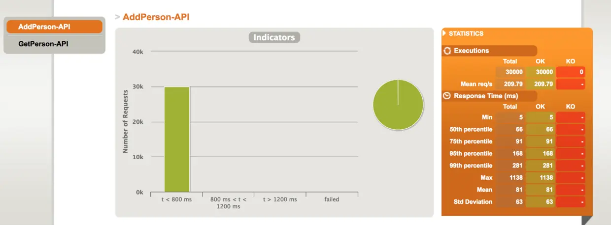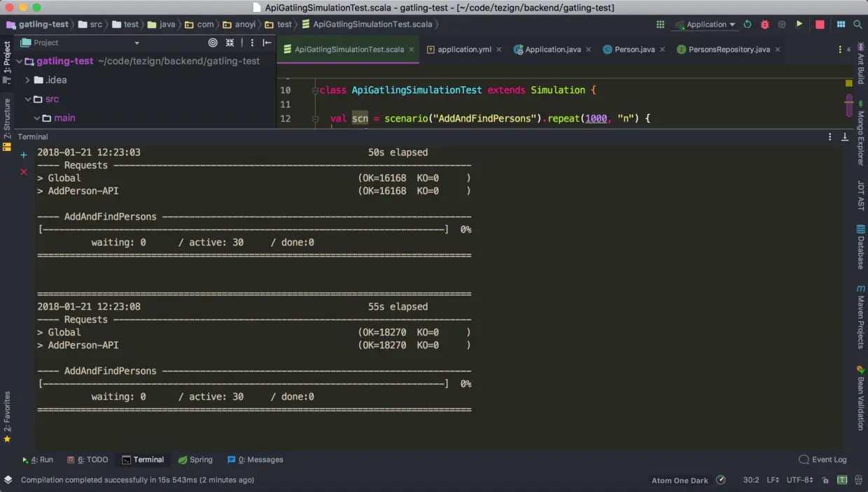 每一个 Gatling 测试都要继承 Simulation 类,在里面你可以使用Gatling Scala DSL 来声明一个场景列表。这里的目标是运行 30 个客户端,同时发送 1000 次请求。首先,客户端通过调用 POST /persons 方法将添加数据到数据库中;然后,尝试通过调用 GET /persons/{id} 方法使用 id 来查询数据。