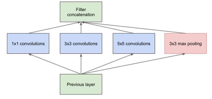 传统的层叠式网络,基本上都是一个个卷积层的堆叠,每层只用一个尺寸的卷积核,例如VGG结构中使用了大量的3×3卷积层。事实上,同一层feature map可以分别使用多个不同尺寸的卷积核,以获得不同尺度的特征,再把这些特征结合起来,得到的特征往往比使用单一卷积核的要好,谷歌的GoogleNet,或者说Inception系列的网络,就使用了多个卷积核的结构: