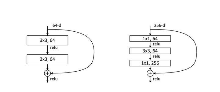- 256维的输入先经过一个1×1×64的卷积层,再经过一个3×3×64的卷积层,最后经过一个1×1×256的卷积层,输出256维,参数量为:256×1×1×64 + 64×3×3×64 + 64×1×1×256 = 69,632。足足把第一种操作的参数量降低到九分之一!