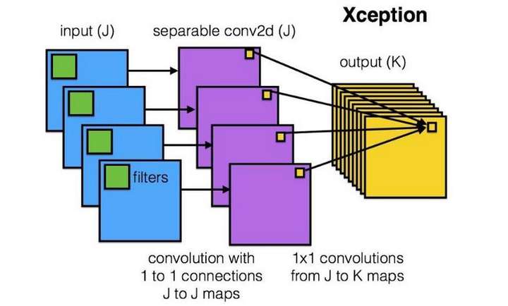 Xception网络就是基于以上的问题发明而来。我们首先对每一个通道进行各自的卷积操作,有多少个通道就有多少个过滤器。得到新的通道feature maps之后,这时再对这批新的通道feature maps进行标准的1×1跨通道卷积操作。这种操作被称为 “DepthWise convolution” ,缩写“DW”。