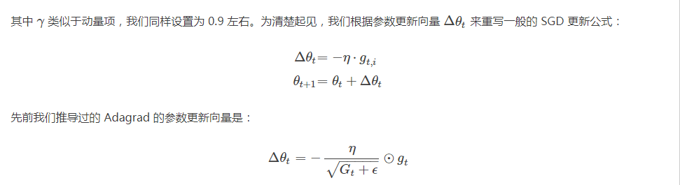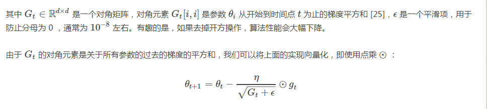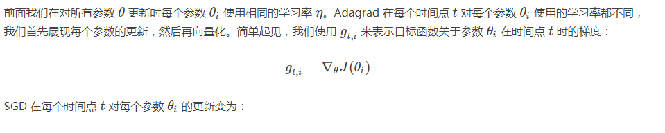 - 另外,相同的学习率被应用到所有参数更新中。如果我们的数据比较稀疏,特征有非常多不同的频率,那么此时我们可能并不想要以相同的程度更新他们,反而是对更少出现的特征给予更大的更新。