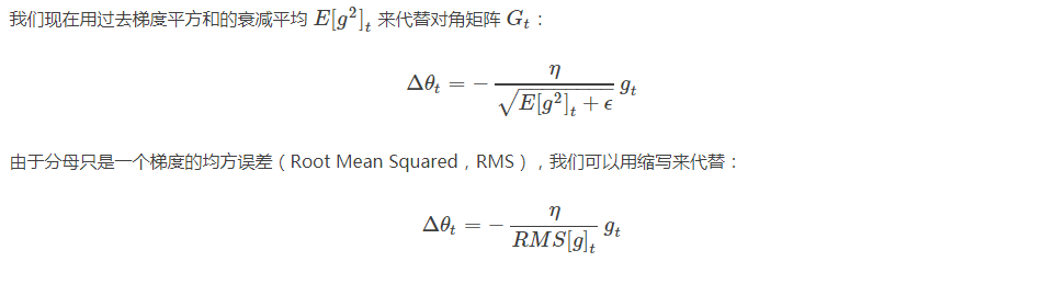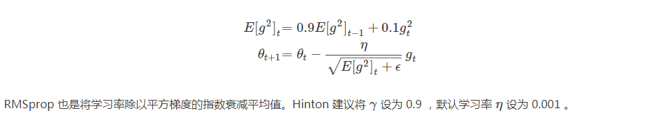 RMSprop 和 Adadelta 在同一时间被独立地发明出来,都是为了解决 Adagrad 的学习率递减问题。事实上 RMSprop 与我们上面讨论过的 Adadelta 的第一个更新向量一模一样: