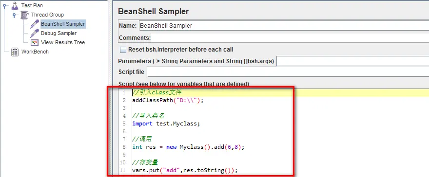 在bean shel中通过source("代码路径 ")方法引入java,然后调用方法和java一样,new一个class,再调用里面的add 方法。