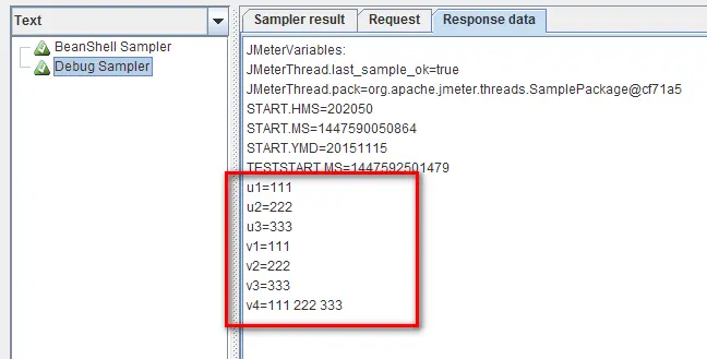 a、bean shell可以接受传入参数,如下图:${u1} ${u2} ${u3}