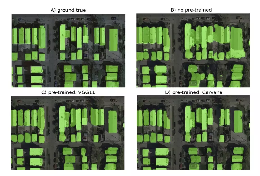 在此论文中,作者展示了如何使用预训练权重轻松改进 U-Net 的性能。作者还将它应用到航空图像标注数据集 [8] 中,该数据集包含多个城市的高清航空图像。这些图像的每个像素都被标注为「建筑」或「非建筑」类别。该架构另一个成功应用案例与初始化方案是 Kaggle Carvana 图像分割竞赛 [9],本论文作者之一使用它作为解决方案的一部分,获得了第一名。