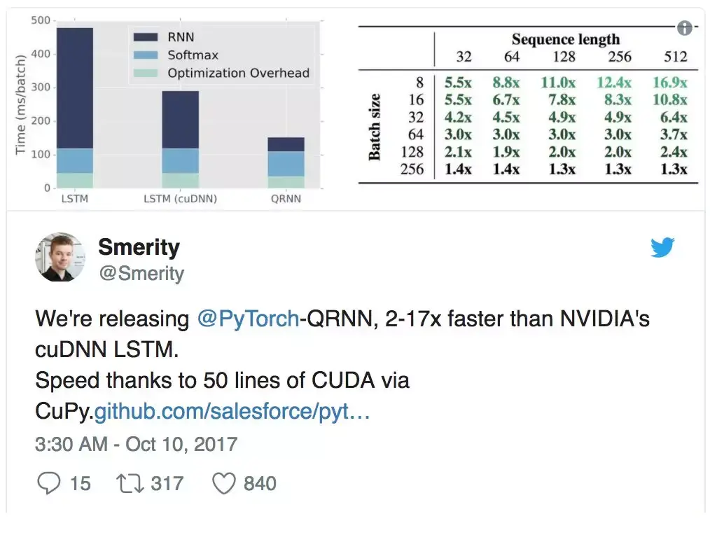 Salesforce 发布了若干个工具包,包括其亮点成果 PyTorch-QRNN,这是一种新型 RNN,相比于 CuDNN 优化的标准 LSTM 可提速 2 到 17 倍。James Bradbury 及其团队是 PyTorch 社区中最活跃和最有吸引力的团队之一。