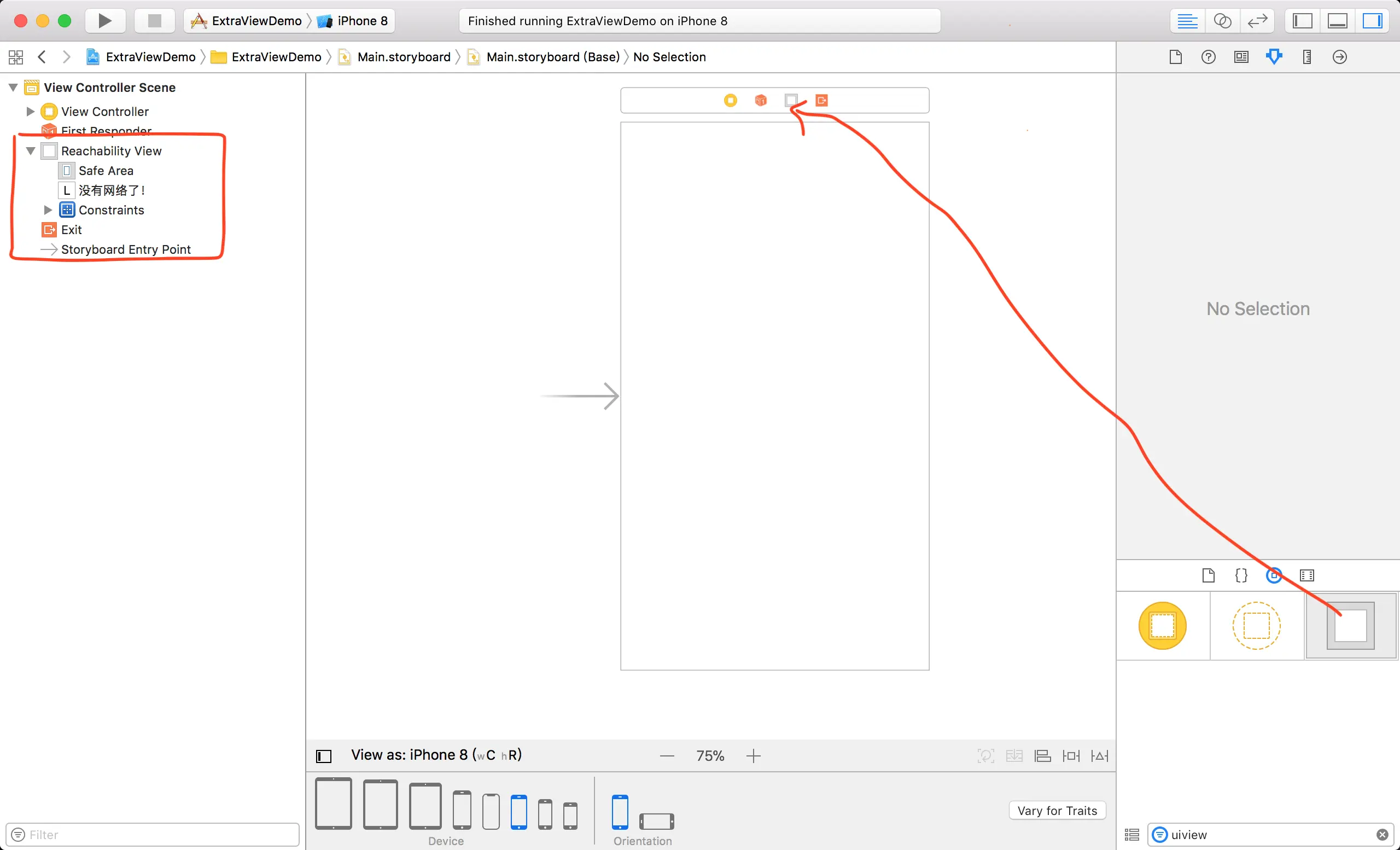 我们通常会有这样的需求,一个VC在特定的情况下或者固定的操作后显示一个View,比如,没有网络的时候的提示页面。SB允许在Scene中添加Extra View来完成这些事情。下面介绍如何使用。我们拖一个View到First Responder和exit中间,如图所示: