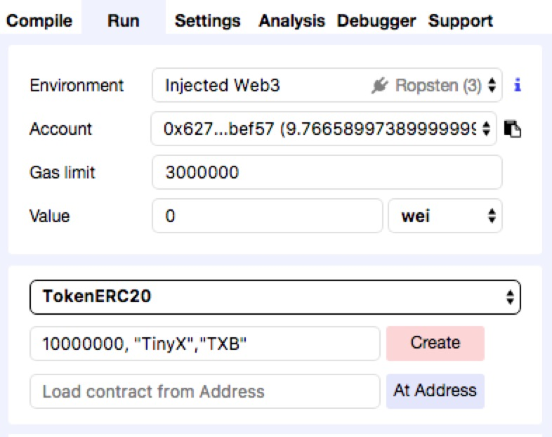 注意Environment和Account和MetaMask保持一致,然后选择合约TokenERC20,填入你想要的发行量,名称及代号,就可以创建合约了。 这时MetaMask会弹出一个交易确认框,点SUBMIT。待合约部署交易确认之后,复制合约地址。