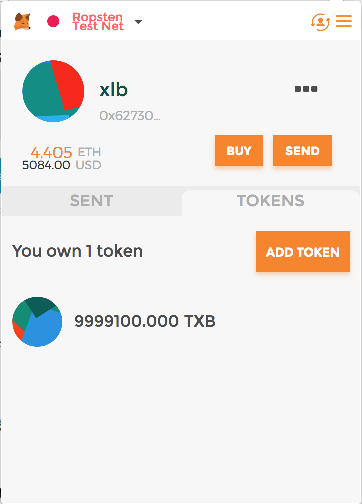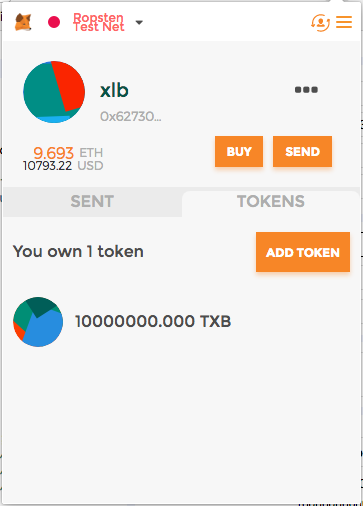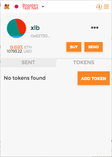 安装和配置MetaMask请参考开发、部署第一个去中心化应用,不同的上本文选择了以太坊的测试网络Ropsten,如果你没有余额请点击购买buy,进入的网站可以送一些测试以太币给你,配置好之后,界面应该如下: