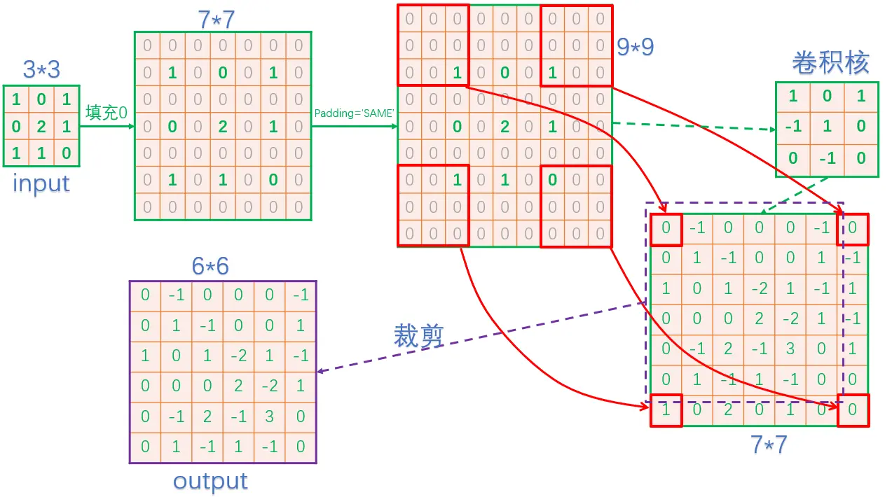 其实通过我绘制的这张图,就已经把原理讲的很清楚了。大致步奏就是,先填充0,然后进行卷积,卷积过程跟上一篇文章讲述的一致。最后一步还要进行裁剪。好了,原理讲完了,(#.#)....