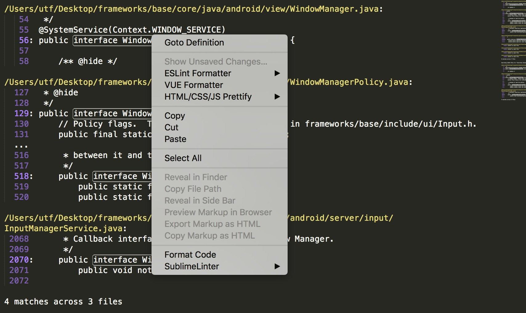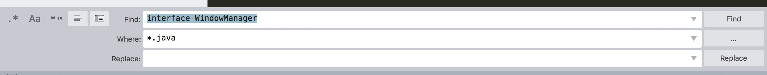 - 快速搜索接口, 类,mac 下快捷键command+shift+f. where可以指定某个file或folders或一些正则表达式缩小检查范围。 如图所示: