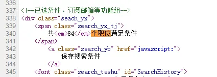 但这次数据格式好像比较复杂一点,我们如果仅仅简单用<em>84</em>标签包裹的内容来获取职位数的话好像已经行不通了,因为该网页很多的地方也使用了<em>标签,那怎么办呢,这时候我们只能使用正则表达式来匹配了.