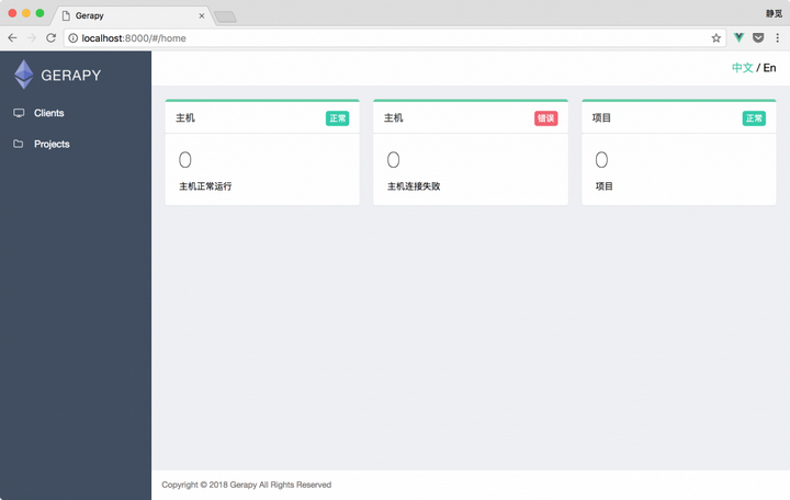 这里显示了主机、项目的状态,当然由于我们没有添加主机,所以所有的数目都是 0。