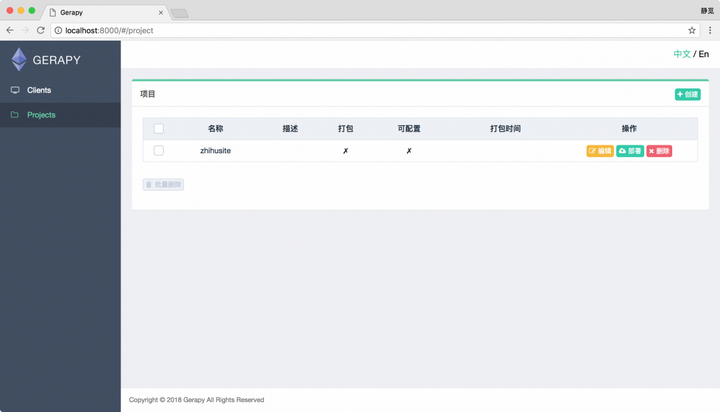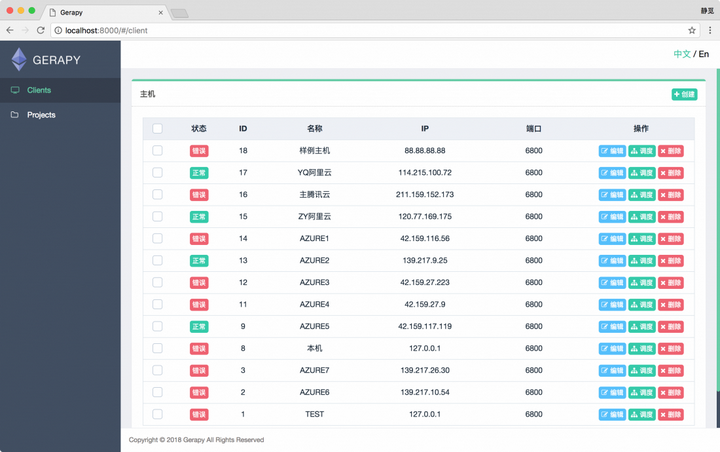 接下来我们在浏览器中打开 http://localhost:8000/,就可以看到 Gerapy 的主界面了: