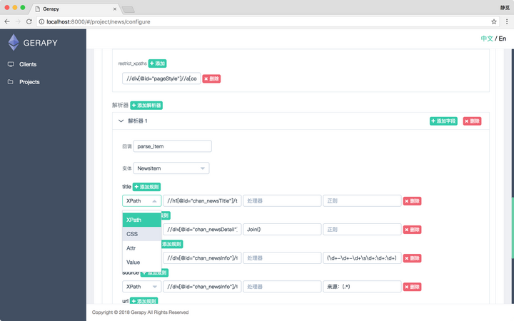我们可以点击项目页面的右上角的创建按钮,增加一个可配置化爬虫,接着我们便可以在此处添加提取实体、爬取规则、抽取规则了,例如这里的解析器,我们可以配置解析成为哪个实体,每个字段使用怎样的解析方式,如 XPath 或 CSS 解析器、直接获取属性、直接添加值等多重方式,另外还可以指定处理器进行数据清洗,或直接指定正则表达式进行解析等等,通过这些流程我们可以做到任何字段的解析。