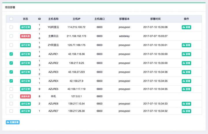 打包成功之后,我们便可以进行部署了,我们可以选择需要部署的主机,点击后方的部署按钮进行部署,同时也可以批量选择主机进行部署,示例如下: