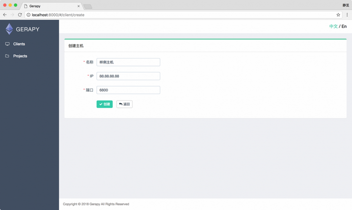 接下来我们可以点击左侧 Clients 选项卡,即主机管理页面,添加我们的 Scrapyd 远程服务,点击右上角的创建按钮即可添加我们需要管理的 Scrapyd 服务: