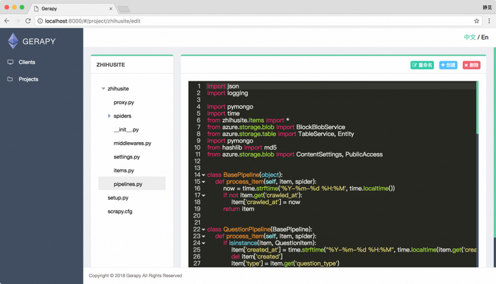 同时 Gerapy 还支持项目编辑功能,有了它我们不再需要 IDE 即可完成项目的编写,我们点击项目的编辑按钮即可进入到编辑页面,如图所示: