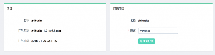 这时我们可以点击部署按钮进行打包和部署,在右下角我们可以输入打包时的描述信息,类似于 Git 的 commit 信息,然后点击打包按钮,即可发现 Gerapy 会提示打包成功,同时在左侧显示打包的结果和打包名称: