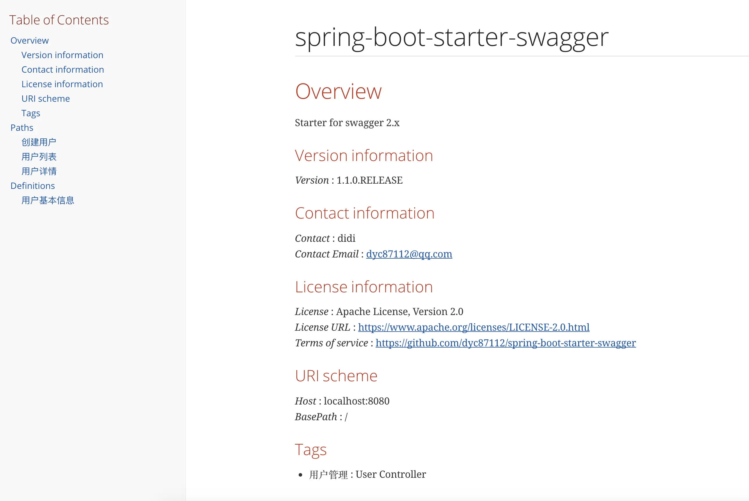 在使用Swagger2Markup之前,我们先需要准备一个使用了Swagger的Web项目,可以是直接使用Swagger2的项目,也可以是使用了spring-boot-starter-swagger的项目,比如我仓库中的:github.com/dyc87112/sw… ,下面就来看看如何使用Swagger2Markup来创建AsciiDoc。