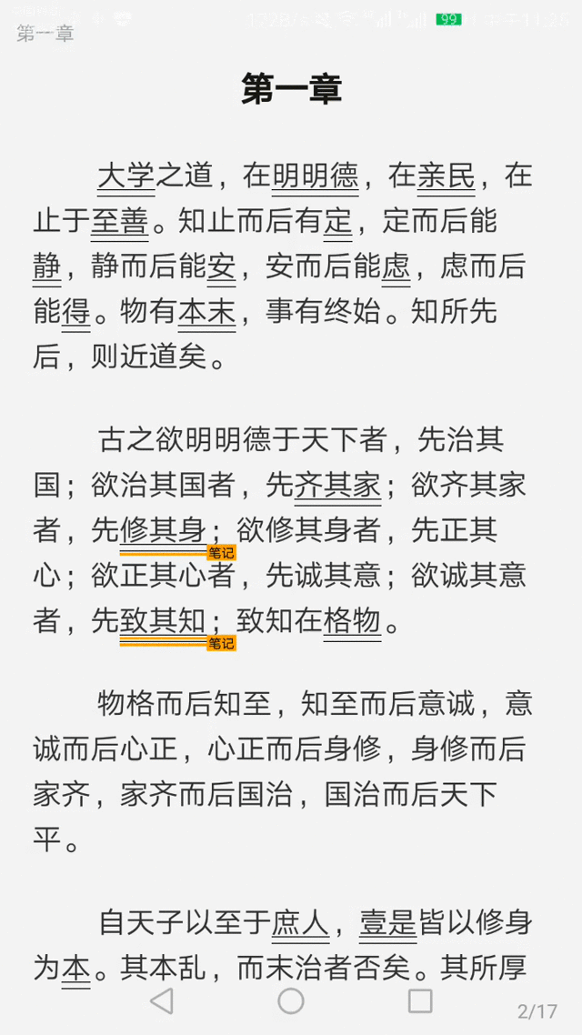 基本的划线逻辑就是以上这些。在用户选择文字的时候可以传入多个记录起始位置和结束位置的对象,并且可以传入自定义的各种flag然后再ondraw里根据这些不同的flag改变线的位置 画笔的设置等等画出不同的划线,而且可以在所划线的后面自定义一些标识比如上图的笔记标识等等,加标识可以借鉴开始写的 大牛 Android机动车的博文链接。
