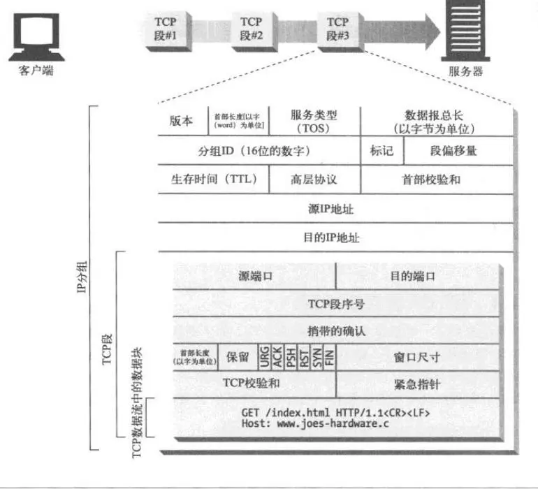 几乎所有的HTTP通信都是由TCP/IP承载的,HTTP要传送一个报文,会以流的形式将报文数据内容通过一条打开的TCP连接按序传输。TCP收到数据流后会将数据流切成小段的数据块,并将段封装在IP分组中,通道因特网进行传输,每个IP分组包括: