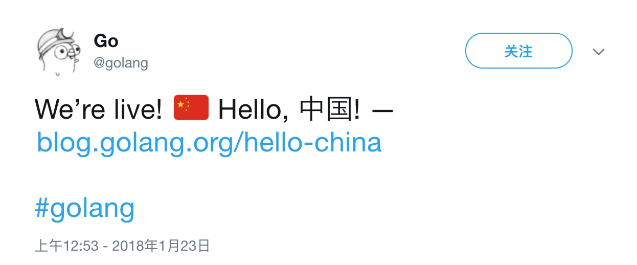 Andrew Bonventre 于昨天在 blog.golang.org 发表了文章 Hello, 中国!。宣布现在 Gopher 们可以通过 golang.google.cn 访问 Golang 官网了,不再需要翻墙。