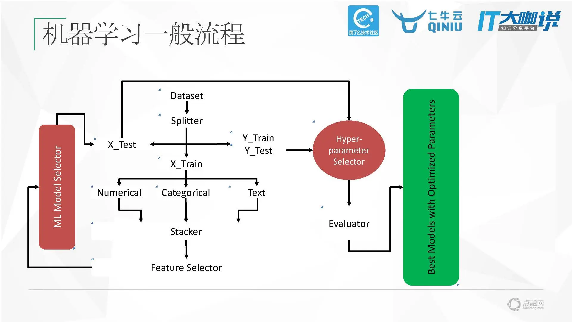 机器学习的一般流程首先是有一个数据集,拿到数据集之后进行拆分,拆成训练集和测试集。根据测试集的内容有数字类型的,有分类变量的,还有文本类型的,拿到这些变量后进行融合。