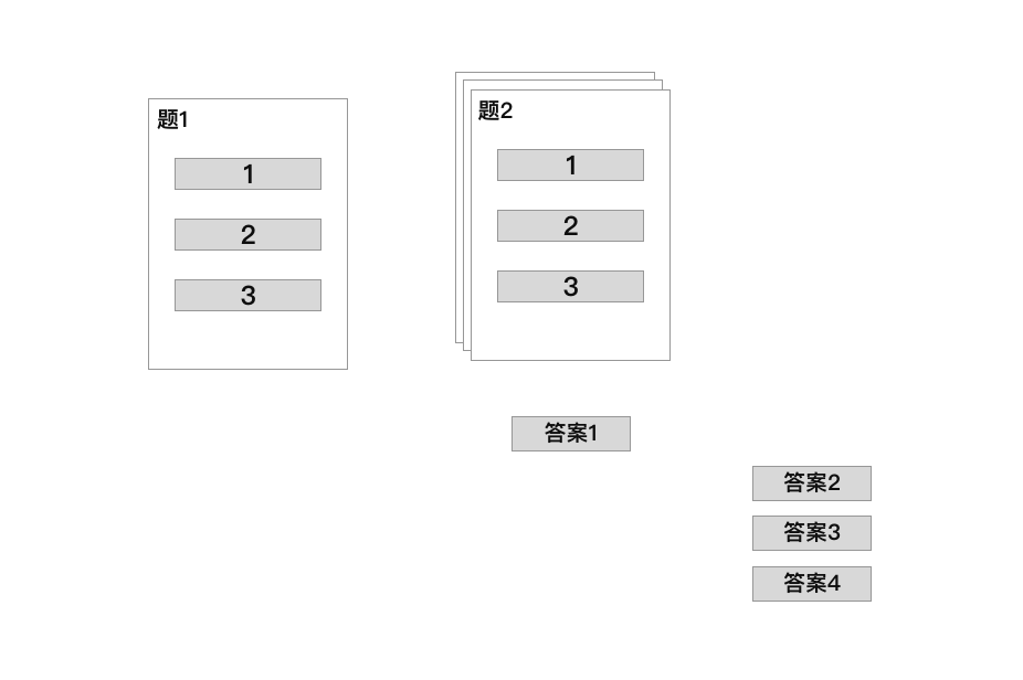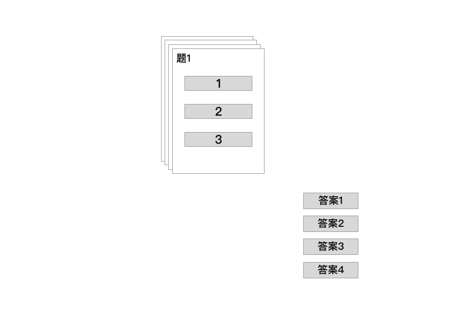 题目卡片一张张叠加在一起,并把答案藏于屏幕外,通过点击卡片上的按钮,把卡片移除,并把答案移入屏幕。如下图: