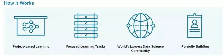 该项目的四门课程具备以下特点:基于项目学习,能够很方便地关注学习进度,由全球最大的数据科学社区提供支持,可以将项目经验写入个人履历。